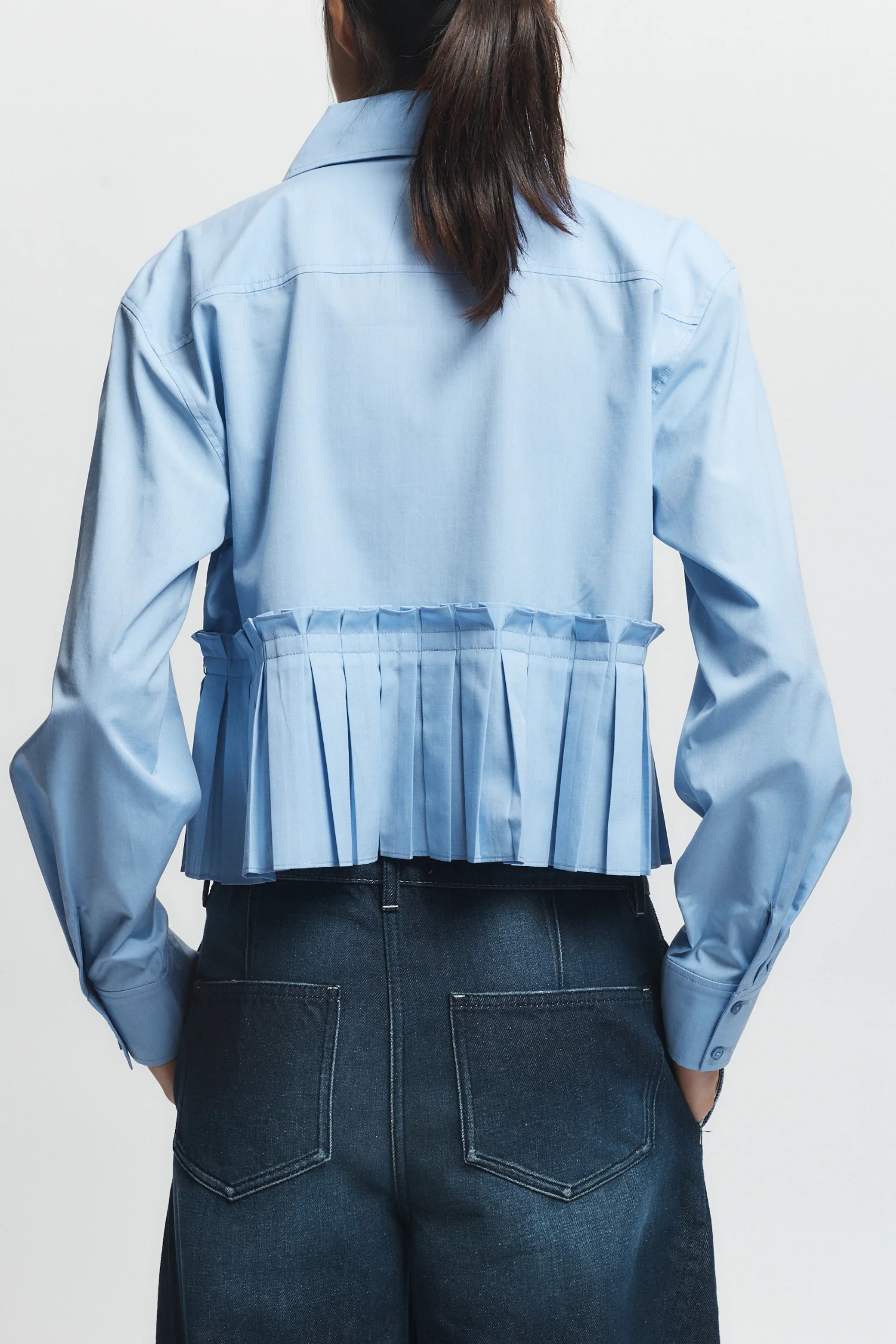 Crafted from crisp blue chambray poplin, the Mila Ruched Poplin Blouse features delicate pleating that adds refined texture and shape. Its tailored silhouette and subtle ruching create a flattering fit, making it an ideal complement to the casual yet polished Stevie Barrel jean. This blouse balances structure with softness, perfect for elevating everyday looks with expert ease.